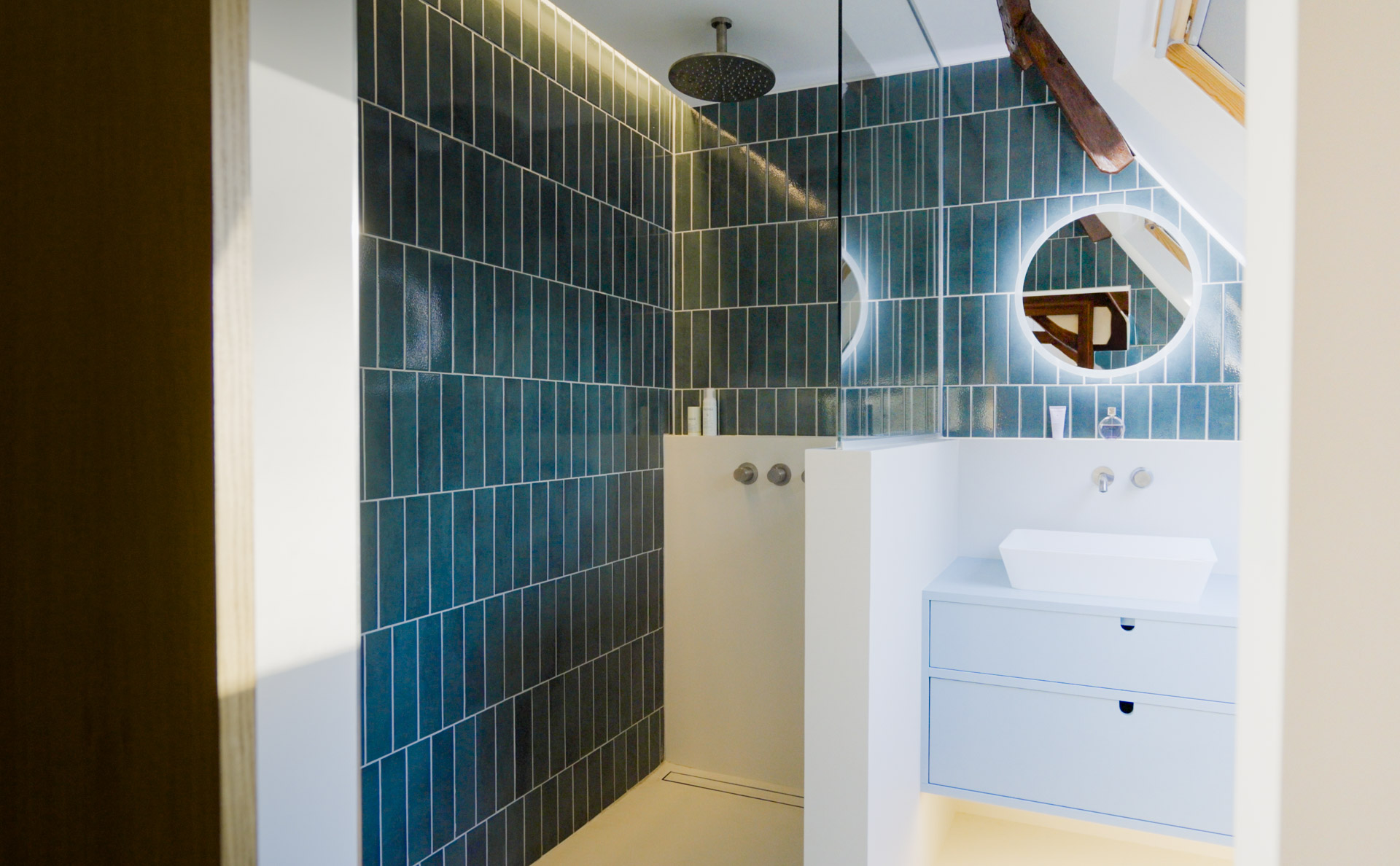 Les zones basses accueillent les éléments techniques, les plus hautes une douche à l’italienne.